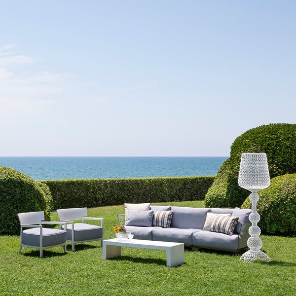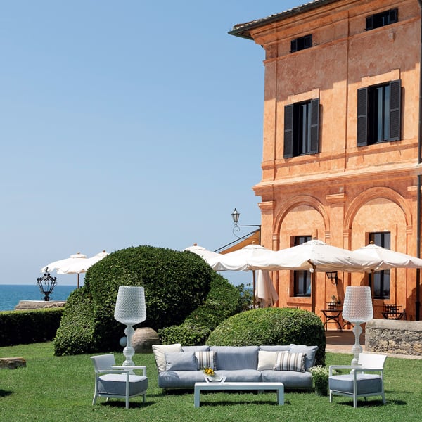Pop outdoor is the modular sofa with evanescent profiles characterised by large seat and backrest cushions which make it soft and comfortable, made with fabrics conceived specifically for outdoor use. The Pop collection is completed by an armchair with the same features.